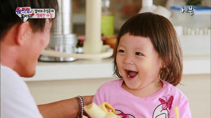 Pertama, gue bisa lebih tau tentang tradisi orang korea, kehidupan sehari-hari mereka, cara orang tua korea membesarkan dan mendidik anak-anaknya, melihat sisi-sisi keluarga korea yang pastinya gak kita dapatkan di drama, film atau acara variety show lain. Gue yakin apa yang mereka lakukan tidak berdasarkan script, karna kebayang gak sih nyuruh anak-anak balita bersikap sesuai script? konsep per episode pasti, tapi kalo script? aku sih no ahahaha.